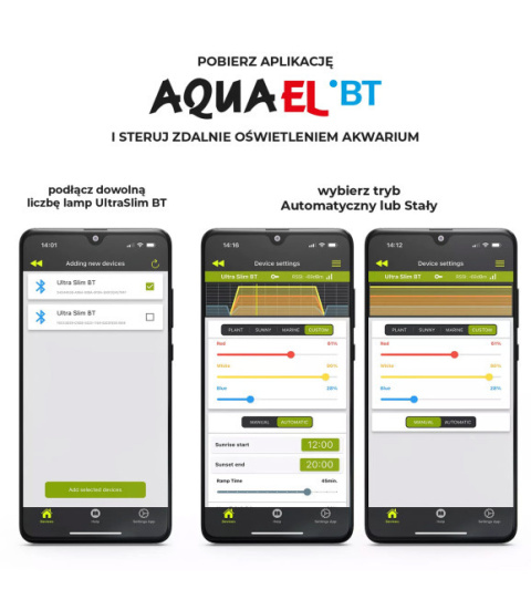 Masz zdalną kontrolę nad oświetleniem Twojego akwarium dzięki aplikacji Aquael BT. Umożliwia ona komunikowanie się z lampą UltraSlim poprzez urządzenia mobilne takie jak smartfon czy tablet, wykorzystując do tego celu technologię Bluetooth. Aplikacja umożliwia zdalne dostosowanie parametrów oświetlenia – takich jak intensywność, temperatura barwowa czy czas świecenia – do indywidualnych wymagań zbiornika. Za jej pomocą możliwe jest także sterowanie kilkoma lampami UltraSlim czy współdzielenie dostępu przez inne osoby. Aquael BT można zabezpieczyć kodem PIN.