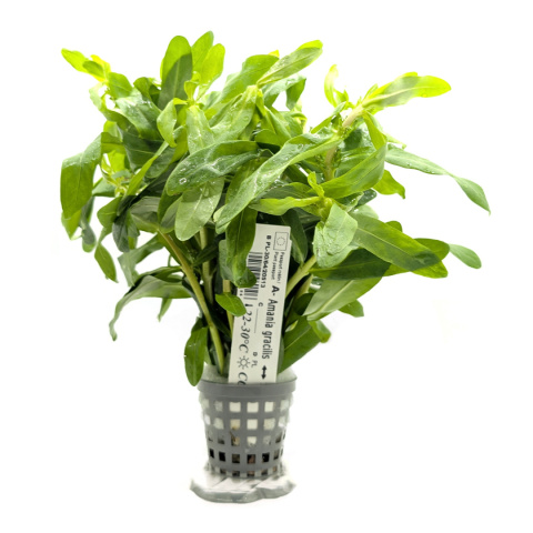 Ammania gracilis to efektowna roślina łodygowa pochodząca z Afryki Zachodniej, ceniona za intensywnie ceglasty kolor w warunkach akwariowych. W formie emersyjnej (czyli uprawianej nad wodą), jaką otrzymasz w koszyczku, roślina ma szerokie, zielone liście. Po umieszczeniu w akwarium i odpowiedniej adaptacji jej liście wydłużają się, a kolor przechodzi w głęboki ceglasty, pomarańczowoczerwony lub purpurowy. Świetnie nadaje się na tylny plan zbiornika, gdzie tworzy gęste, pionowe grupy.