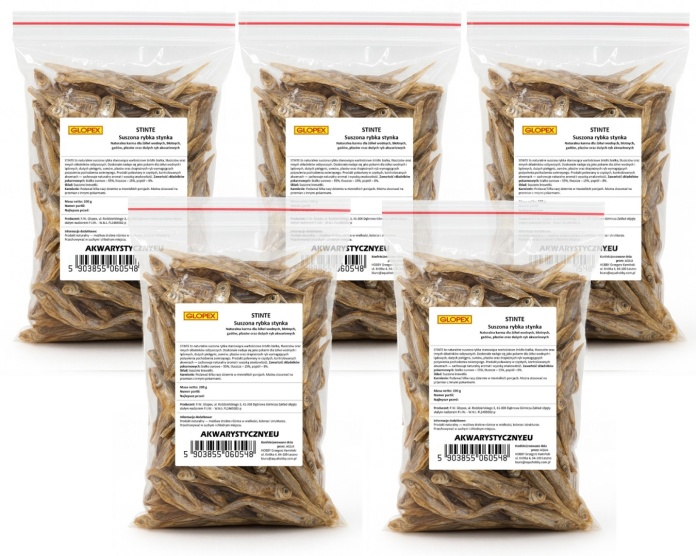 Glopex Stynka to w pełni naturalny, suszony pokarm o bardzo wysokiej wartości odżywczej. Idealnie sprawdza się w żywieniu dużych ryb mięsożernych i wszystkożernych, żółwi wodnych oraz wielu gatunków gadów i płazów trzymanych w terrariach. Dzięki delikatnemu procesowi suszenia rybki zachowują pełnię wartości odżywczych i są chętnie zjadane przez zwierzęta.