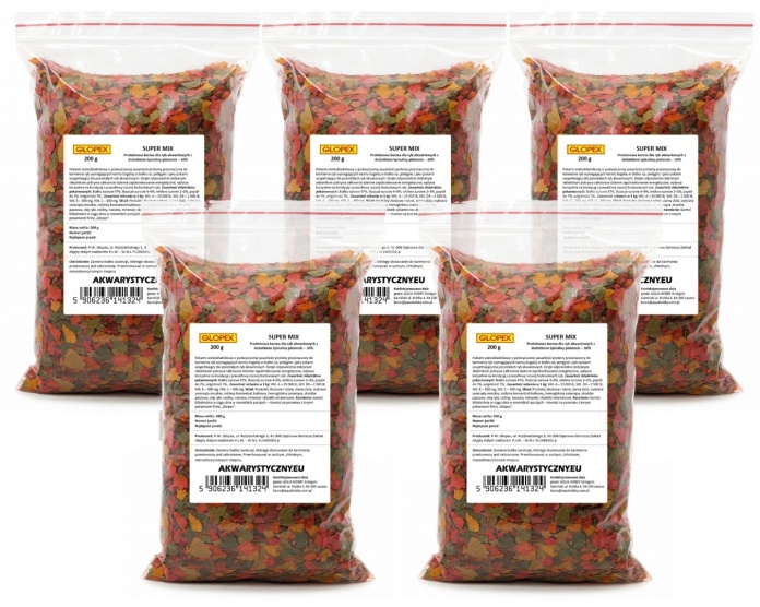 Glopex Super-Mix w dużym, ekonomicznym zestawie 1 kg to najwyższej klasy pokarm płatkowany dla ryb wszystkożernych wymagających diety o podwyższonej zawartości białka. Receptura oparta na 30% Spirulina Platensis oraz białku na poziomie 47% wspiera szybki wzrost, zdrowie, intensywne wybarwienie oraz silny układ odpornościowy.