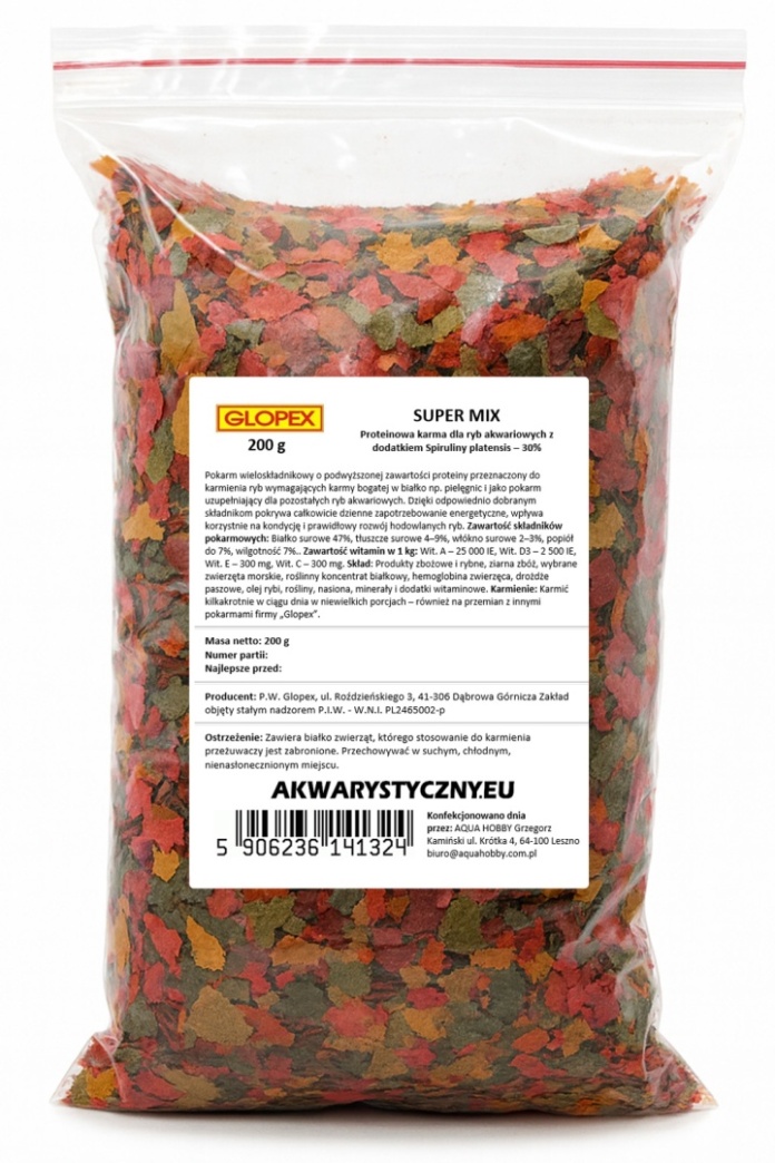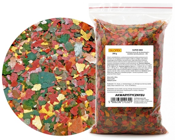 Glopex Super-Mix to najbardziej zaawansowany pokarm płatkowany marki Glopex. Powstał z myślą o rybach wszystkożernych wymagających diety bogatej w naturalne glony morskie oraz wysoką zawartość białka. Receptura oparta na 30% Spirulina Platensis i białku na poziomie 47% gwarantuje szybki wzrost, intensywne wybarwienie oraz doskonałą kondycję i odporność.