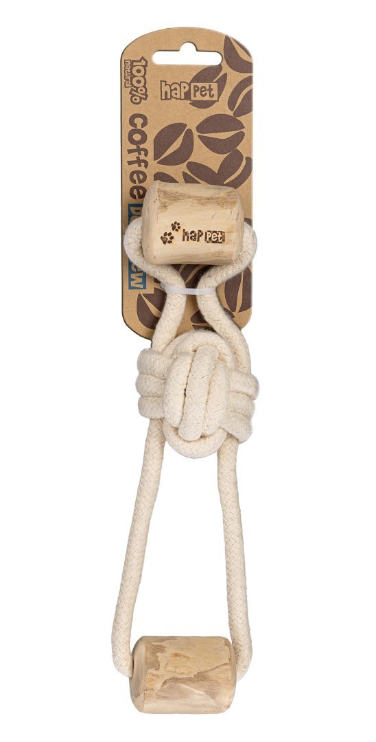 Szarpak bawełniany z drzewa kawowego M Szarpak z drzewa kawowego ze sznurkiem bawełnianym to w 100% naturalny produkt! Taka zabawka jest przyjazna dla środowiska, bezpieczna dla psa i po porstu trwała. Zapewnia zatem długie godziny wyśmienitej zabawy i okazji do realizowania naturalnych psich potrzeb! Szarpak wykonany z naturalnych materiałów łączy w sobie drewno kawowe z bawełnianym sznurkiem. Zabawka nie zawiera żadnych sztucznych składników. Mimo że powstała z drzewa kawowego, nie zawiera także kofeiny. Zabawki w formie szarpaków są idealne do wspólnej zabawy psa i opiekuna. Podczas przeciągania szarpaka lub jego aportowania, nawiążesz i umocnisz swoją więź z pupilem. Zadbasz również o jego potrzeby behawioralne i kondycję. Psy uwielbiają gryzienie, szarpanie i aportowanie. Fragmenty z drzewa kawowego są twarde i nie kruszą się jak zwykłe patyki. Unikasz tym samym niebezpiecznych dla psa ostrych fragmentów. Szarpaki dla psów dostępna są w różnych wersjach, dlatego możesz dopasować je do preferencji swojego pupila. Wybieraj spośród różnych długości sznura oraz odmiennych wielkości bloczków z drzewa kawowego. Zwróć uwagę, że w odróżnieniu od wielu kalorycznych gryzaków, szarpaki z drzewa kawowego nadają się również dla psów z nadwagą lub alergiami. Zalety szarpaków z drewna kawowego: wykonane z naturalnych materiałów trwałe bezpieczne dobre dla środowiska naturalny zapach umożliwiają psu realizację naturalnych potrzeb sprzyjają wspólnej zabawie i budowaniu więzi z psem dostępne w różnych rozmiarach i wariantach Jeżeli chcesz, by szarpak służył Twojemu psu przez długi czas, przechowuj go w suchym miejscu i unikaj wilgoci. Wymiary: 36 x 7 cm Waga: 174g