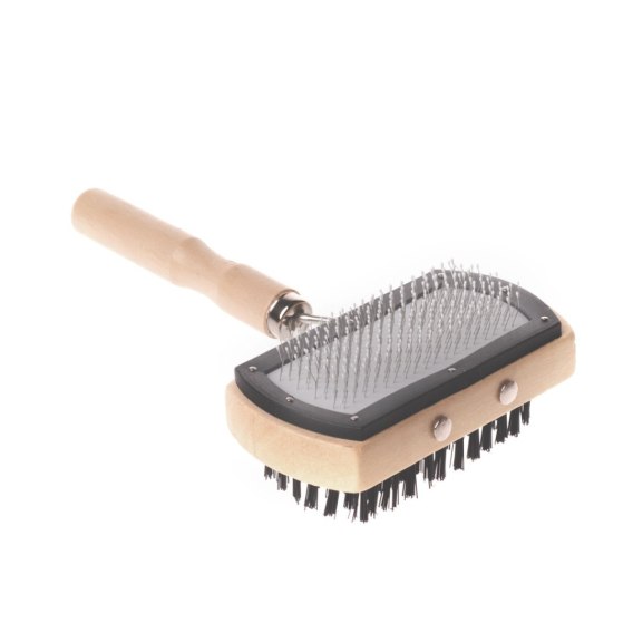 Dzięki dwóm różnym stronom – z drucianymi ząbkami i sztywnym włosiem – pozwala kompleksowo zadbać o sierść zwierzaka: od usuwania podszerstka, po wygładzanie wierzchniej warstwy.