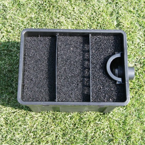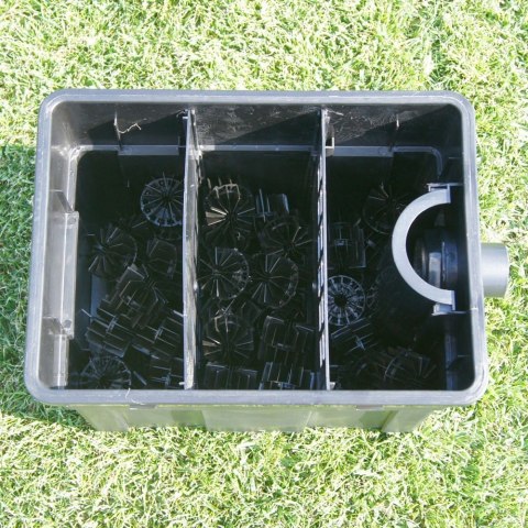 Efektywność filtracji zapewnia bardzo pojemny kubeł na złoża filtracyjne (o pojemności ok. 40l), zapewniając rozkład szkodliwych związków azotowych, poprzez działanie bakterii nitryfikacyjnych oraz niezwykle skuteczną filtracje mechaniczną. Woda wpompowywana do filtra jest mocno napowietrzana, dzięki czemu filtracja spienionej wody jest o wiele bardziej skuteczna.  Filtr jest łatwy w użytkowaniu oraz czyszczeniu. Posiada komplet wlotów (w różnych rozmiarach) oraz wylotów o wysokiej przepustowości. Zestaw wylotowy może być wykorzystany jako wodospad lub fontanna.