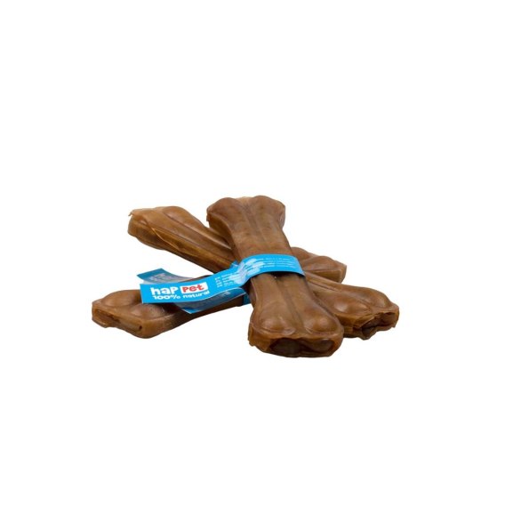 Kość naturalna prasowana 25cm (3szt.) Dla psów Kości firmy Happet produkowane są ze specjalnej masy przygotowywanej z rozgotowanej skóry wołowej, która następnie zostaje wysuszona i sprasowana na kształt prawdziwej kości. Dzięki tym procesom przysmak jest przyjemnie twardy, nie psuje się oraz pachnie i smakuje. Jest to wspaniała zabawka zapewniająca psu zajęcie na długie godziny, a także pyszny smakołyk. Produkt jest całkowicie bezpieczny, nie zawiera sztucznych zapachów, konserwantów, ani barwników, jest w 100% strawny. Kość naturalna to świetna zabawka i przydatna nagroda w trakcie treningu. Kość jest idealną zabawką, ale nie tylko: jest przysmakiem dla psa, dlatego może służyć jako nagroda zaspokaja potrzebę żucia i gryzienia, która jest niezwykle istotna zapewnia psu zajęcie na dłuższy czas w naturalny sposób dba o czyste zęby naszych pupili zapobiega osadzaniu się kamienia nazębnego masuje dziąsła wyróżnia się wysoką zawartością białka i niskim poziomem tłuszczu jest doskonała dla każdego psa, także dla psów mających problem z utrzymaniem prawidłowej wagi ściera naloty bakteryjne osadzające się na zwierzęcych zębach, mogące być przyczyną nieświeżego oddechu i chorób przyzębia żucie takich gryzaków rozładowuje napięcie i łagodzi wszelkie objawy stresu u psów można podawać między posiłkami nie wydają brzydkiego zapachu jak surowe kości Długość: 25 cm Opakowanie: 680g, 3 szt. Skład: skóra wołowa Analiza: białko 82%, włókno 0,5%, tłuszcz 0,5%, popiół surowy 1%, wilgotność 18% Pamiętaj! Przysmaki dla psów nie mogą zastąpić pokarmu podstawowego. Pomimo, że dostarczają niektórych składników pokarmowych, są tylko przyjemnym urozmaiceniem codziennej diety pupila. Nie podawać szczeniętom poniżej 3 miesiąca życia.