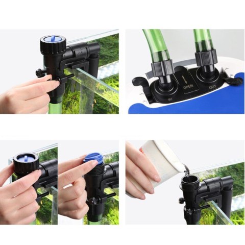 - Wlot i wylot wody - filtr wyposażony został w system "aqua-stop", który blokuje dopływ wody z filtra do węży i umożliwia ich odłączenie od pokrywy filtra, co jest niezbędne podczas prac pielęgnacyjnych. Filtr SunSun HW-3000 posiada podwójny wlot wody - pierwsza rurka, dolna, pobiera wodę z okolic dna, a jej długość może być regulowana poprzez zastosowanie dodatkowych segmentów rurek. Umożliwia to zassanie nieczystości zalegających przy dnie, które często odpowiadają za pogorszenie się jakości wody. Ten element jest wyposażony w zabezpieczające sitko, nie trzeba więc się martwić o bezpieczeństwo ryb, które znajdują się w jego okolicy. Drugi wlot jest w postaci skimmera powierzchniowego, który pobiera wodę z jej tafli, usuwając białko oraz zanieczyszczenia obniżające jakość wody. Do zalania węży służy specjalny korek, który znajduje się u szczytu wlotu i wylotu, co umożliwia szybkie zalanie węży przed startem filtra. Wylot wody można dowolnie modyfikować dzięki dużej ilości kształtek i rurek.