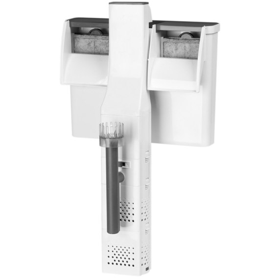 - Podwójny prefiltr gąbkowy: Zamiast klasycznej rurki zasysającej wodę filtr wyposażony jest w modułowe dwa kosze wypełnione gąbką akwarystyczną, co skutecznie filtruje mechanicznie, wspierając czystość wody już na samym początku.