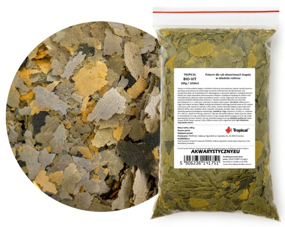 Tropical Bio-Vit to pełnoporcjowy, roślinny pokarm w płatkach do codziennego karmienia ryb roślinożernych. Zawiera błonnik, składniki roślinne i spirulinę, które wspierają trawienie, kondycję oraz prawidłową pracę jelit. Produkt konfekcjonowany z dużego wiadra po 200 g (ok. 1050 ml) do woreczków strunowych.
