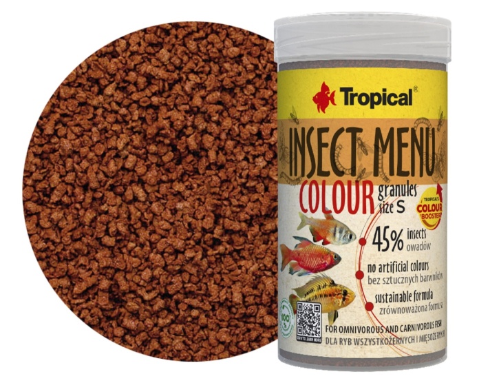 Insect Menu Colour Granules S to wysokobiałkowy, tonący pokarm granulowany o średnicy 1,2 mm, opracowany specjalnie z myślą o rybach wszystkożernych i mięsożernych. Wzbogacony o 45% białka – w tym aż 45% z trzech gatunków owadów (Hermetia illucens, jedwabnik i mącznik młynarek), zawiera też naturalne źródła barwników roślinnych i alg. Formuła Tropical Colour Booster zapewnia szybkie, naturalne wzmocnienie kolorów.