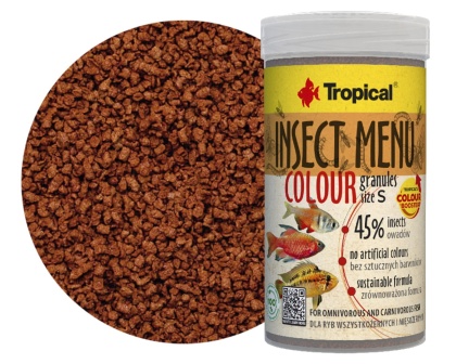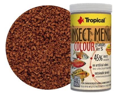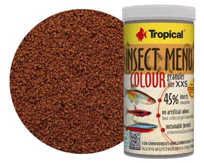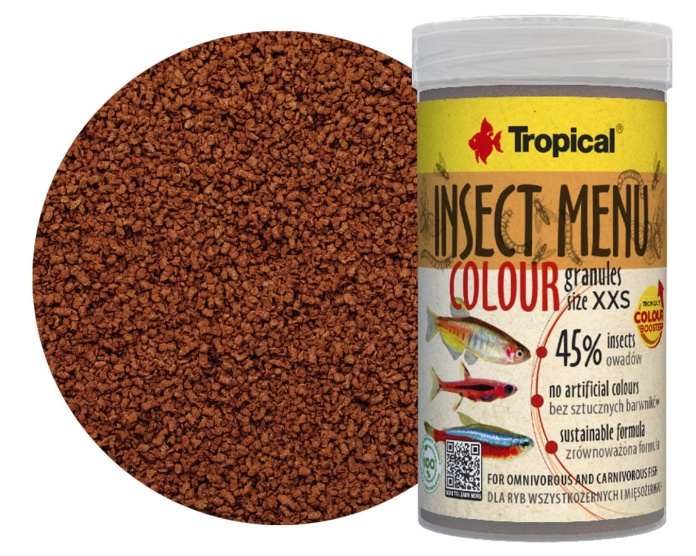 Insect Menu Colour Granules XXS to tonący pokarm w formie wyjątkowo drobnego granulatu (0,5 mm), przeznaczony dla wszystkożernych i mięsożernych ryb akwariowych. Zawiera 45% wysoko przyswajalnego białka, w tym aż 45% z owadów: Hermetia illucens, jedwabnika oraz mącznika młynarka. Dzięki innowacyjnej formule Colour Booster ryby szybciej się wybarwiają, rosną i zachowują doskonałą kondycję.