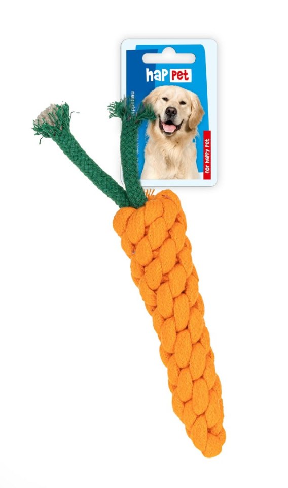 Sznurkowa marchewka Sznurku, co my byśmy bez Ciebie zrobili? Choć na co dzień nie zwracamy na niego uwagi, to po zastanowieniu się można dojść do wniosku, że jest to bardzo ważny dla naszego życia wynalazek. Sznurkiem wiążemy przedmioty które mają się trzymać razem, na sznurkach zawieszamy to co ma dyndać w powietrzu. Lin i sznurków używa się do wspinaczki i na budowie, oraz do mechanizmów działających na żaglówkach i statkach. Ten niepozorny przedmiot nie przestaje zaskakiwać swoją funkcjonalnością, dlatego prezentujemy serię gryzaków dla psów które są z niego zrobione. Te zabawki wytrzymają każdy nacisk szczęk i każde silne szarpnięcie. Można nimi rzucać, tarmosić je, przeciągać i robić z nimi wszystko, co tylko da Twojemu psu radość. Sznurkowe zabawki zostały wykonane z trwałego materiału, w pełni bezpiecznego dla zwierząt. Dostępne są kształty: kulka z pętlą, kulka, kulka z dwiema pętlami, marchewka, toroid. Wymiary: 21 cm Waga: 134g