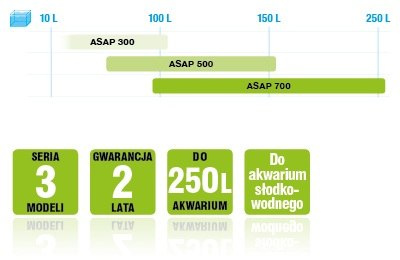 Filtr wewnętrzny ASAP składa się z nowoczesnego, energooszczędnego silnika umieszczonego w eleganckiej obudowie oraz dużego, transparentnego pojemnika wypełnionego starannie dobraną gąbką filtracyjną. Przepływająca przez nią woda podlega zarówno wydajnej filtracji mechanicznej jak i – dzięki szybko osiedlającym się w gąbce bakteriom – biologicznej. Dzięki temu pozostaje klarowna i bezpieczna dla zamieszkujących zbiornik zwierząt. Bieżąca eksploatacja filtra polega na odłączeniu od niego pojemnika filtracyjnego i jego wymianie na nowy lub wypłukaniu gąbki w wodzie spuszczonej z akwarium. W tym celu nie trzeba wyjmować ze zbiornika całego filtra, co jest bardzo dużym udogodnieniem i znacznie skraca czas jego obsługi.