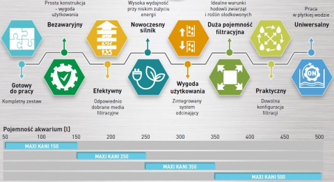 Linia MAXI KANI obejmuje cztery modele filtrów (MAXI KANI 150, 250, 350 i 500) dedykowane do zbiorników akwariowych o pojemności od 50 do nawet 500 litrów.